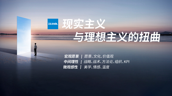 企业发展经营往两头看都是感性的,中间层是理性的。中间层战略、战术、方法论、组织、KPI所有这一套基因的东西,包括财务都是理性层面的。在中间层,我们保持理性就好。但仅仅保持理性是不够的,我们还得打开格局往上走,去不断自我提升,触碰天花板。就有了上层使命、价值观、愿景、这类感性的东西。再往下看,微观层面的东西。做品牌,需要很好的美学修养,艺术、文学的修养。真正好的消费品是能给用户带来美感和温度的。这类美学、情感、温度也是属于感性层面。我们需要在这个层面用感性思维去触碰,给用户制作更多的愉悦体验。