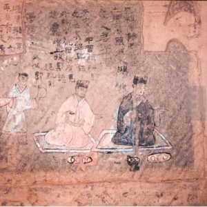 第五幅壁画,两黑衣男子相对而坐,空白处有两处题榜:“广汉守丞、瓦曹吏、创农诸□掾□子女长生□□□□□父造此墓”“蜀太守文鲁掾、县官啬夫、诸书掾史堂子元长生”。荆子女曾任广汉守丞,汉代太守之下分设议曹、贼曹、仓曹、田曹等官,分别掌管谋议、侍卫、民户、耕作等等,瓦曹过去不见于史书记载,可能主管瓦的生产。荆子元则担任文鲁掾、县官啬夫一职,啬夫与县丞地位近似,大概负责听讼、赋税一类事务。荆子元身后还站着两个毕恭毕敬的小吏,并用墨书点名了他们的身份——司空与司空佐。汉代实行“三公九卿”制度,所谓“三公”,便是司徒、司空、司马。事实上,汉代郡、县以及军队中也设有司空,不过只是小吏而已,司空佐是司空的助手,职位就更低了。