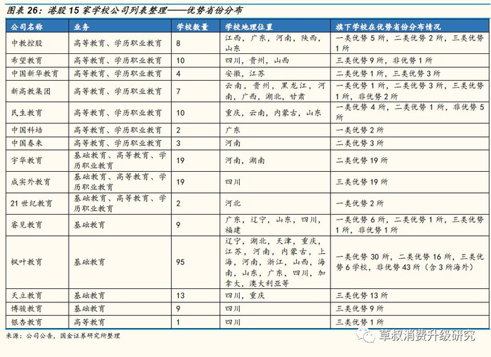 中教控股(一类优势5所,二类优势2所,三类优势1所),希望教育(三类优势9所,非优势1所),中国新华教育(二类优势1所,三类优势3所),建议关注宇华教育(二类优势19所),睿见教育(一类优势6所,二类优势1所,三类优势1所,非优势1所)等。