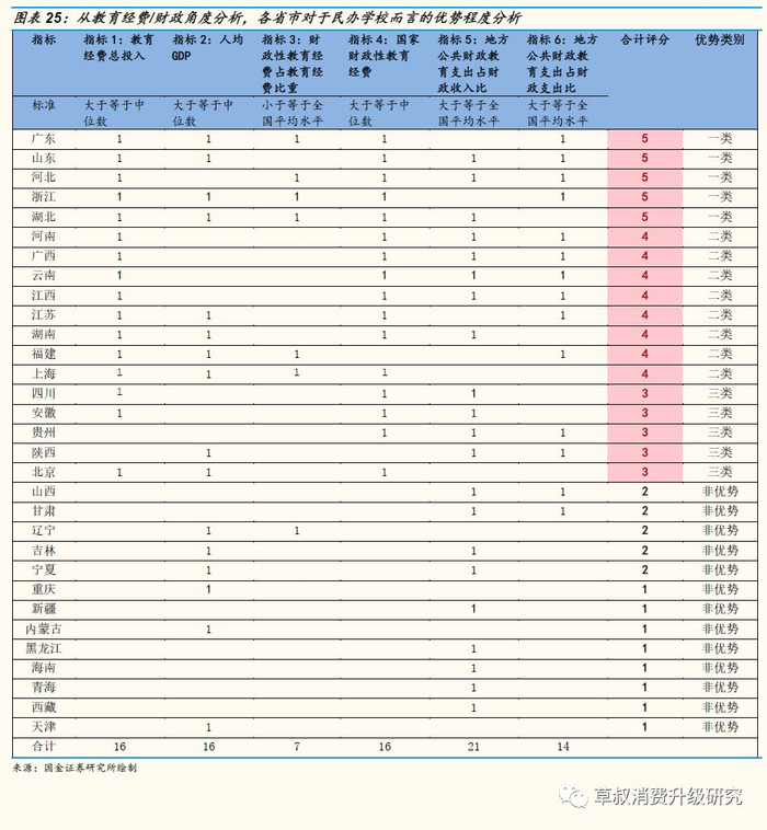 结合6个指标的排名和赋值,我们对于各省市进行了综合排名,我们把得分大于等于3分的称为优势地区(18个),小于3分的称为非优势地区(13个)。我们认为该评分从财政角度出发,对民办学校的地理位置选择上有一定参考价值,得分越高,排名越靠前的省市,我们认为更需要民办学校的投入,对于民办学校的态度也更加欢迎,也有更大的概率在政策上给予高于平均的优惠力度。