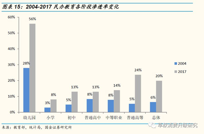 ——1997-2017二十年间我国经历了优先发展小学,之后是初中的过程,目前是处于加强稳固对于义务教育的投入,并加速发展学前、高中及高等教育的时期。这个过程中,民办教育的位置,是非常重要的。