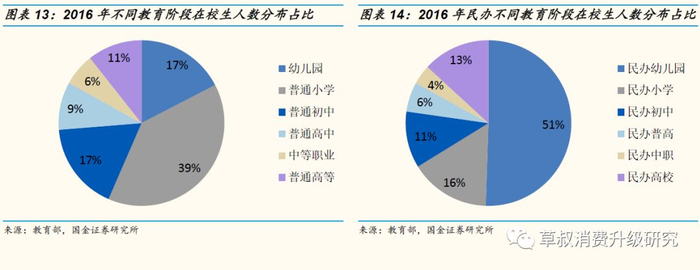 ③普通教育中,义务教育阶段(小学和初中)是最重要的两部分,2016年占地方公共财政支出合计为46.6%(占普通教育的59.8%),呈现略有上升的趋势,尤其是小学阶段,预计国家会保持对于义务教育的高投入。义务教育阶段的投入与全国在校生结构中义务教育阶段的占比基本匹配,2016年全国小学和初中在校生人数占总人数(幼儿园到高教)比重为56.3%。