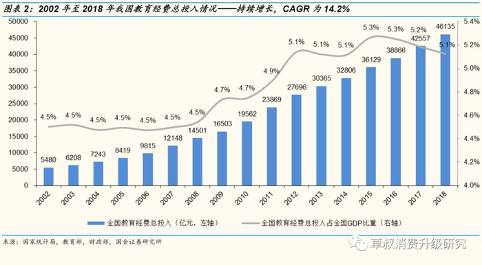 整个社会对于教育的投入持续增长,自2012年以来,我国教育经费总投入占GDP比重均在5%以上。我国一直并长期重视教育工作,并致力于提高教育经费使用效益,教育经费总投入在2002-2018年16年间CAGR为14.2%,自2012年以来,我国教育经费总投入占GDP比重均在5%以上,2018年全国教育经费总投入高达46135亿元,2018年同比增速为8.4%,未来有望进一步提高教育经费总投入。