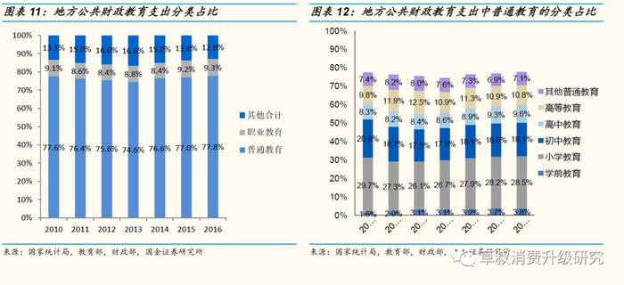 ④普通教育中,高中阶段,2016年占地方公共财政支出比重为9.6%(占普通教育的12.3%),呈现略有上升的趋势,基本与在校生人数占比9.3%相匹配。广义高中阶段(包含职高等)尚未实现100%的毛入学率,预计未来这部分的财政投入仍会有所提升。