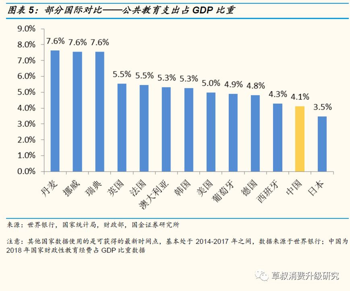 与国际发达国家相比,目前我国财政对于教育的投入占GDP比重仍有一定提升空间。北欧国家如丹麦、挪威、瑞典公共教育支出占GDP比重均在7%以上,而英、法、澳、韩、美均在5%以上,相对大部分发达国家而言,长期来看,我国财政对于教育的投入占GDP比重仍有一定提升空间。