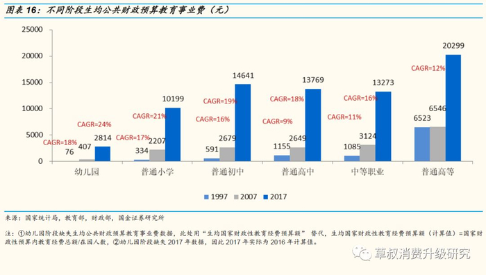 幼儿园阶段,因缺失生均公共财政预算教育事业费数据,用“生均国家财政性教育经费预算额” 替代,生均国家财政性教育经费预算额,由1997年的76元/人升至2007年的407元/人,1997-2007CAGR为18%,到2016年,仅为2814元/人,2007-2016CAGR为24%,相较1997-2007增长有所提高。