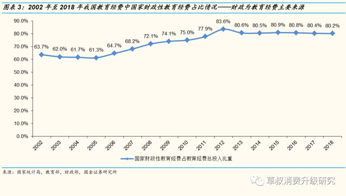——“公办财政教育支出,依然是教育支出的主体”。国家财政性教育经费占GDP比重均在4%以上,2018年国家教育财政经费投入达3.7万亿元,预计短期内该比重会相对稳定,我国教育经费中80%以上来源于国家财政性教育经费。