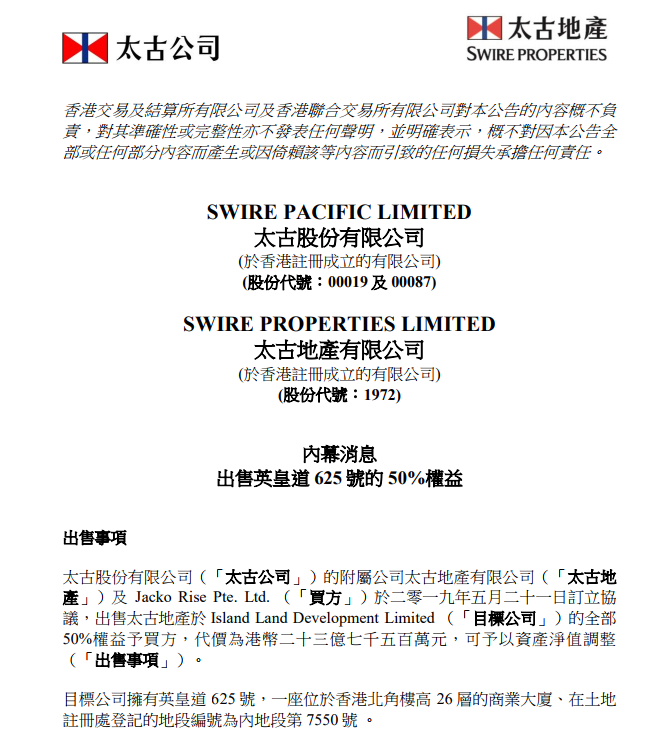 太古股份有限公司的附属公司太古地产有限公司及 Jacko Rise Pte. Ltd.(买方)于二零一九年五月二十一日订立协议,出售太古地产于 Island Land DevelopmentLimited (目标公司)的全部50%权益予买方,代价为港币23.75亿。