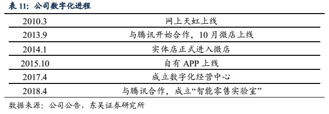 作为需要兼顾供应链到终端销售的零售企业,前中后台的高效信息系统,是企业能否保持高效率运转的基本保障。天虹的自有数字化系统目前已经成为百货业内的数字化标杆企业。天虹的网上门店最早上线于10年3月,15年推出独立APP,17年将电商事业部更名为数字化经营中心。这套自有的整体数字化系统已经从简单的前端引流向上深入至公司整体运营,不断提升公司整体运营效率,其整体数字化体系已经做到行业领先。