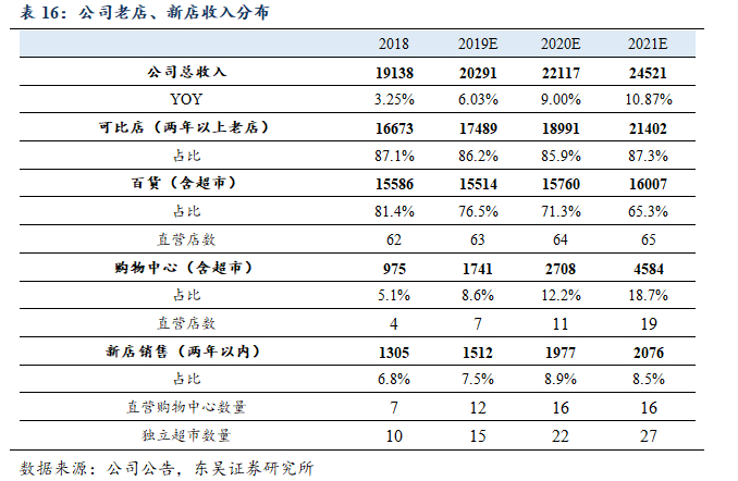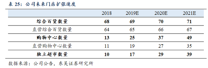 我们预计,未来几年公司会持续保证较快的扩张速度,大店(购物中心+百货)数量有望每年以双位数的速度增长。同时公司的独立超市也会以较快的速度增长。