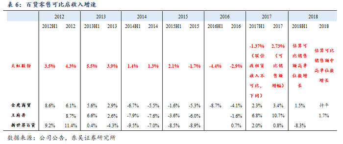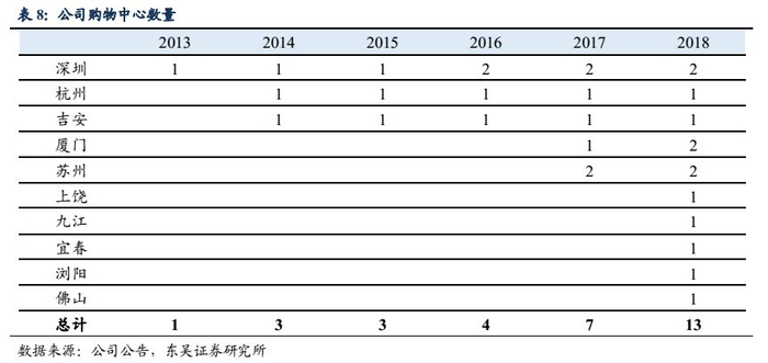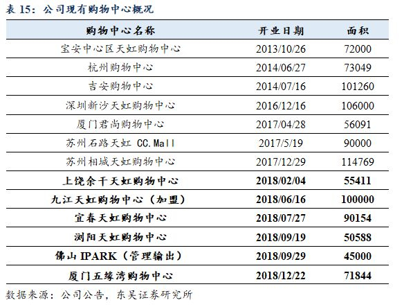 天虹目前的13个购物中心中17年1月1日之前开业的购物中心只有4个,18年1月1日之前开业的购物中心为7个,其中5个为直营购物中心。