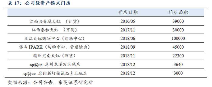 在租赁自营项目之外,公司还在尝试轻资产的加盟和管理输出模式扩张。由于公司较强的零售管理能力,以及现在越来越激烈的购物中心竞争,公司向当地地产商输出管理的轻资产模式预计将会逐步增多。天虹的轻资产模式包括租赁自营、加盟模式(项目使用“天虹”品牌)、管理输出模式(项目方不使用“天虹”品牌)等方式。