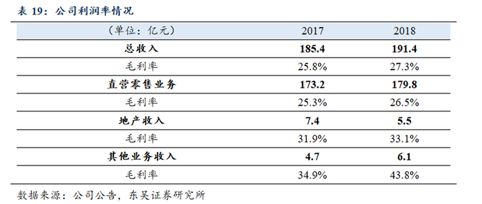 公司的毛利率在近年表现出逐年上升的趋势。公司的业务分为零售、地产和其他业务收入,其中最主要的直营零售业务毛利率从17年的25.3%上升至18年的26.5%。