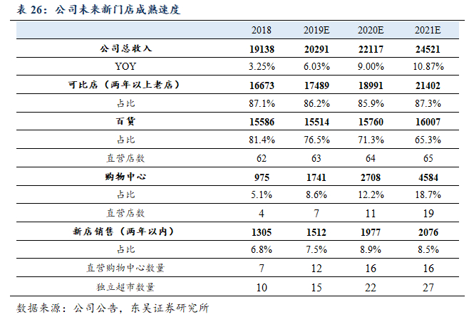 次新店成熟方面,18年的4家成熟购物中心(包含购物中心内的超市)占收入总量相对较小(仅占5.1%);随着已有的几家购物中心的逐渐成熟,以及公司持续在购物中心上的扩张,我们预计在21年开业两年以上的成熟购物中心将能贡献公司接近20%的收入。