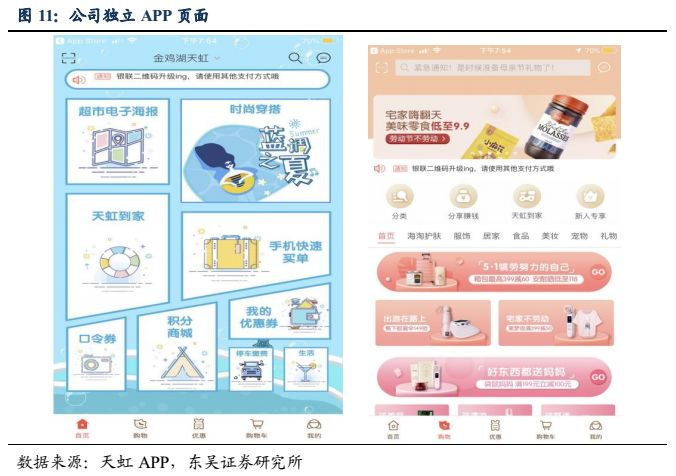 供应链的数字化,提升采购和选品效率。公司的供应链数字化1.0平台在18年5月上线,让供应商可以直接通过线上平台与公司进行合作。19年2月2.0平台的上线,能够实现全国天虹超市品类需求展示功能,提高采购需求匹配度,提升采购效率。供应商可以直接通过微信、逐步扫描功能直接申请成为就近区域的天虹供应商并提报新商品。