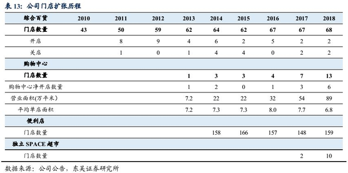 相较于全国性的大型商业地产开发商,“零售商”出身的天虹依靠多年零售经验、灵活的组织架构、以及充分的激励机制,逐渐形成了在不同地域、根据不同硬件条件,打造适应当地消费者的特色业态的能力。公司在传统百货业态之外,已经逐渐具备了超市、购物中心、便利店等多种业态的运营能力,截止18年公司已经拥有68家综合百货、13家购物中心和81家超市。