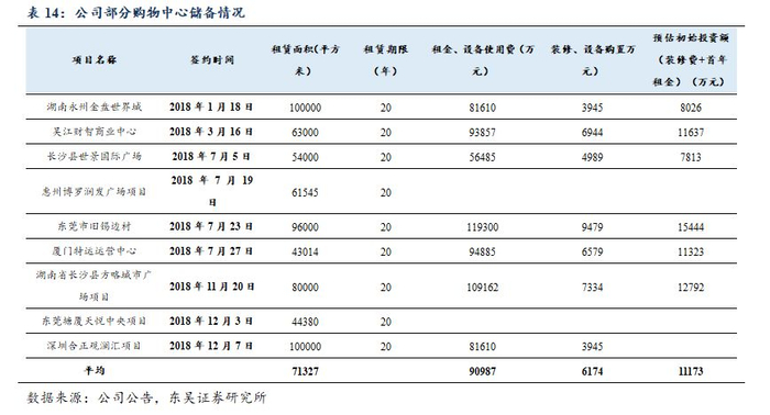 受益于公司较强的零售能力,公司对物业所处的商圈成熟度要求相对较低,有效节约了扩张成本和扩张时间。由于公司较强的零售能力,其有能力成功运营商圈并不成熟的购物中心,这使其可以以较快的速度、较低的成本进行门店扩张。从目前公司公告的储备项目看,公司项目的平均初始装修设备加首年租金,单个项目的初始投资在1.1亿-1.2亿,资本开支基本可控。