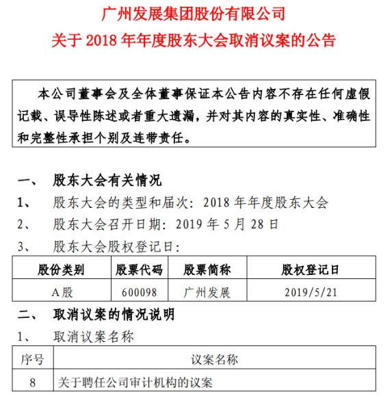 5月20日晚间,广州发展发布公告称,公司2018年年度大会取消“关于聘任公司审计机构的议案”。在取消原因方面,广州发展表示,鉴于证监会对广东正中珠江会计师事务所(特殊普通合伙)立案调查,且调查结果对其从业资格及业务范围等影响的不确定性,基于审慎性原则,公司暂不对其进行续聘并取消2018年年度股东大会中审议聘任公司审计机构事项。