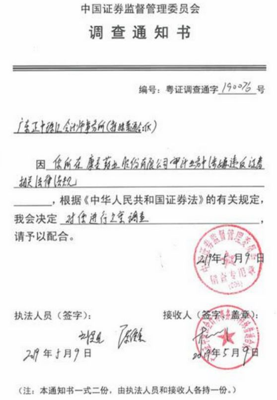 此前,曾有知情人士晒出正中珠江被证监会立案调查的通知书,落款时间为5月9日。通知书显示,正中珠江因在康美药业审计业务中涉嫌违反证券相关法律法规而被立案调查。