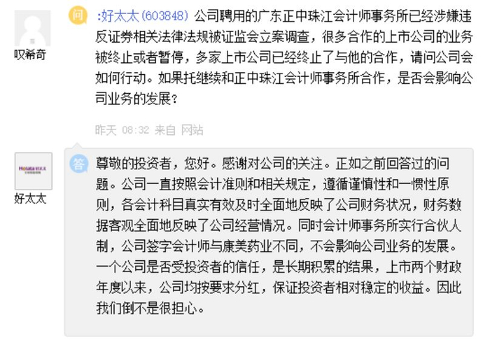 对此,好太太大方表示,“会计师事务所实行合伙人制,公司签字会计师与康美药业不同,不会影响公司业务的发展。”此外,好太太还称,一个公司是否受投资者的信任,是长期积累的结果。对与正中珠江的合作“倒不是很担心”。