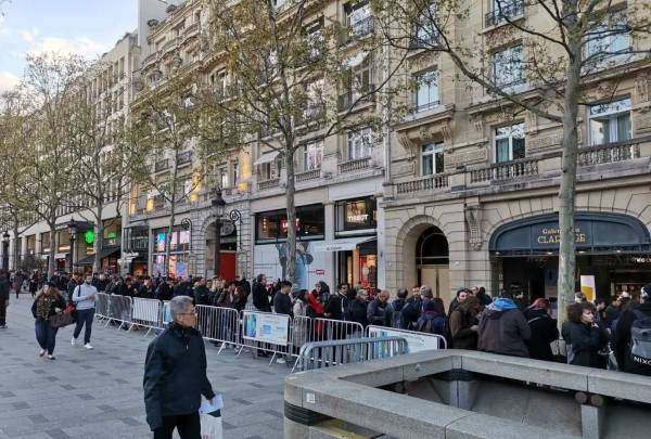 资料图:4月初,法国巴黎,消费者排队购买华为P30系列手机 图自推特
