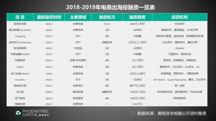 在电商出海领域,资本市场也表现出强烈的信心和兴趣。青桐资本统计从2018年1月至2019年4月,共有14起电商出海相关的融资事件,其中占主流的是B2C电商项目,共有7个,融资轮次主要集中在C轮。此外,围绕电商出海的支付、供应链、物流、培训、软件服务项目也开始获得资本关注。
