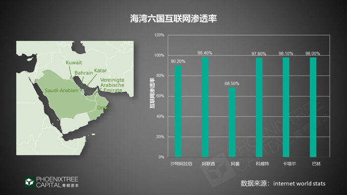 中东地区的海湾国家以“富有”著称,经济发展水平和互联网渗透率均居世界前列。以阿联酋、沙特、卡塔尔、科威特、阿曼和巴林为代表的海湾6国是中东最富有的新兴市场,也是中东出海最主要的区域。海湾六国城市化率超过90%,人均GDP高达2万美元,是中国的2倍之多。除阿曼外,其他5国互联网渗透率均在90%以上,其中阿联酋达到98.4%,位居世界前五。