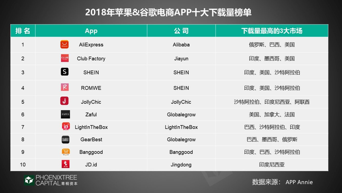 印度、中东是电商出海最关注的区域,shein、clubfactory 、romwe、Jollychic、banggood这5家出海电商,其2018年的用户增长主要来自印度以及中东地区的沙特和阿联酋。