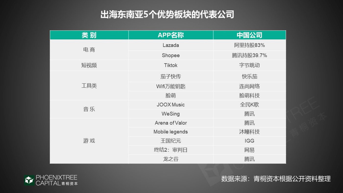 在电商出海领域,东南亚的主要玩家是阿里和腾讯两大巨头。阿里巴巴通过投资控股的方式占东南亚最大的B2C电商平台Lazada83%的股权,腾讯持有最大的C2C平台Shopee的母公司Garena39.7%的股权。