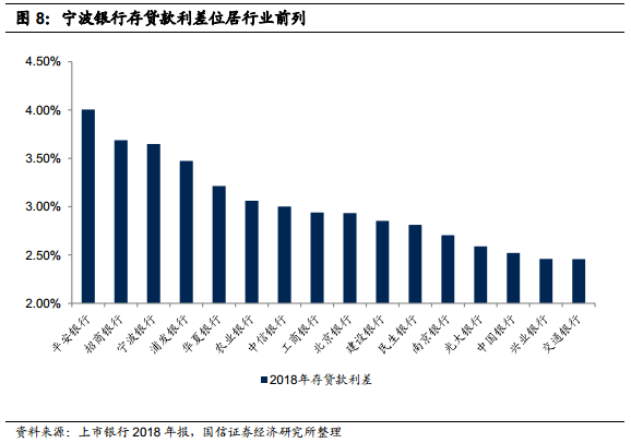 由于贷款利率可观,结合上述存贷款两方面,观察其存贷利差,宁波银行仍然居于行业前列。