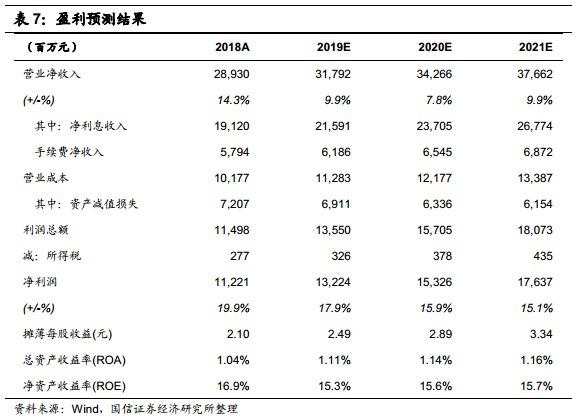 在上述关键假设下,我们预计公司2019-2021年净利润同比增长17.9/15.9/15.1%,归母净利润同比增长增速跟净利润增速相同;2019-2021年ROE为15.3/15.6/15.7%。