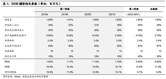 我们使用三阶段DDM估值,以未来三年作为短期(第一阶段,具体盈利预测请见下表及后文),接下来10年作为中期(第二阶段),之后作为永续期(第三阶段)。在前述分析的基础上来设定估值假设: