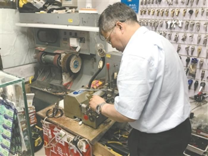 年过半百的袁心三在北京朝阳区一家菜市场里开了一间不到10平方米的店铺,主要从事配钥匙、换锁、修鞋、换电池等便民服务。由于周边居民区密集,周末的傍晚,袁师傅的店里差不多每10分钟就有顾客上门。