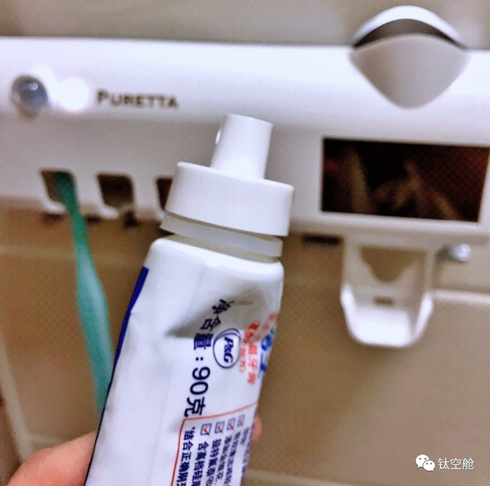 牙刷刷头朝上,往里一捅,便能够挤出牙膏。(捅的幅度越大,挤出的牙膏就越多~)这个设计不仅省去了挤牙膏的繁琐步骤,而且保持了牙膏口的卫生状况。(以空少往常挤牙膏为例,不是牙膏帽找不到,就是牙膏口处盖不严,粘了一堆头发、脏东西……)