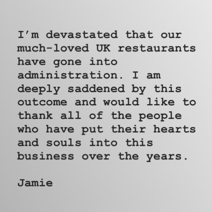 5月21日,来自KPMG 事务所的破产管理员接管了他名下的25家餐厅,大约1000名员工将因此失去工作。杰米·奥利佛目前在英国一共有28家餐厅,此次进入托管程序的是其中的23家Jamie‘s Italian、高级意大利餐厅 Fifteen 和牛排馆 Barbecoa,还有三家将暂时继续营业。此外,海外餐厅和位于英格兰西南部、由基金会管理的 Fifteen Cornwall 将不受影响。