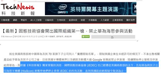 耿直哥进一步调查发现,这个消息只有一个唯一的源头,即台湾一个名为“科技新报”的网站。该网站曾于5月22日宣称他们获得了“独家”信息,称JEDEC已经暂停华为及其子公司海思半导体参加所有协会的活动,直到禁令取消。