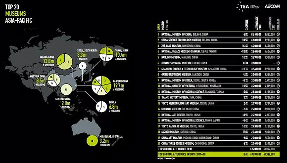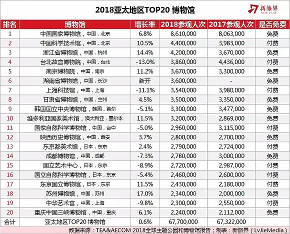 在20家亚太地区最受欢迎博物馆中,有11家博物馆免费向公众开放。整体来看,11家免票博物馆2018年参观人次总数呈正向增长,而收费博物馆总参观人次则下滑了3.2%。不过报告认为,造成这一差距的原因主要是博物馆的区位,和与2017年相比,这些博物馆的临时性展览受欢迎程度,而并非收费与否。