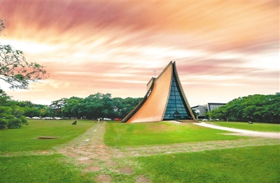 路思义教堂坐落在东海大学宽阔的草坪上,被誉为“台湾最美教堂”。整栋建筑外墙仅由四片曲面墙构成,无柱、无梁、无垂直于地面的墙是路思义教堂的最大特色。