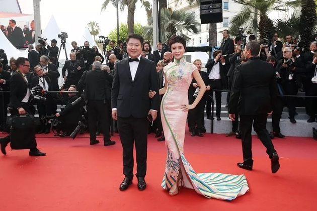 《好莱坞往事》投资方博纳影业董事长于冬携妻子金巧巧亮相红毯(图片来源:博纳影业)