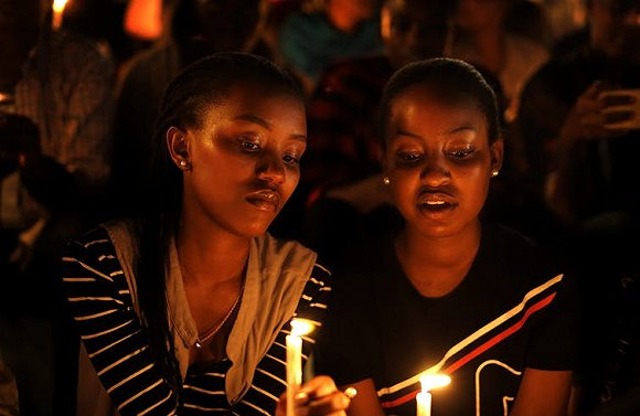 卢旺达女性于2019年4月参加在卢旺达基加利举行的烛光守夜活动,纪念卢旺达种族大屠杀25周年