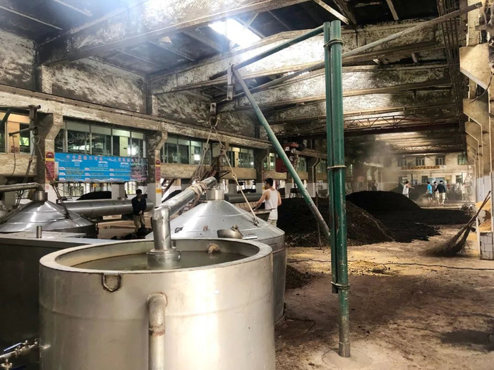 初夏的茅台镇已经有些燥热,制酒车间的空气中混合着酒糟发酵的味道,热气随着粮食蒸腾上升。茅台集团制酒二车间里,十余名工人一组,有的在蒸粮,有的用筢子摊晾拌曲、堆积发酵。短袖、短裤,赤脚,是工人们的共同着装特点。
