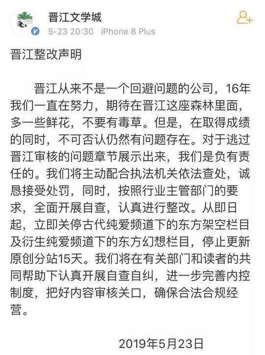 随后晋江文学城官方微博发布声明,即日起关停古代纯爱频道下的东方架空栏目(古耽东方架空)、衍生纯爱频道下的东方幻想栏目(同人耽东方架空),停止更新原创分站15天,展开自查自纠。而墨香铜臭没有发布微博,但是其粉丝发现她修改了晋江专栏信息,变相对外辟谣被抓传闻。
