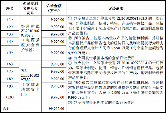江苏通领科技有限公司就一项发明专利和一项实用新型专利向公牛集团提起诉讼,该案的诉讼请求金额合计为9.99亿元。