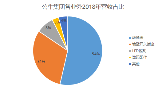 在2018年营收占比中,公牛集团转换器业务占比超过半壁江山,墙壁开关插座业务也有超过30%的市场份额。