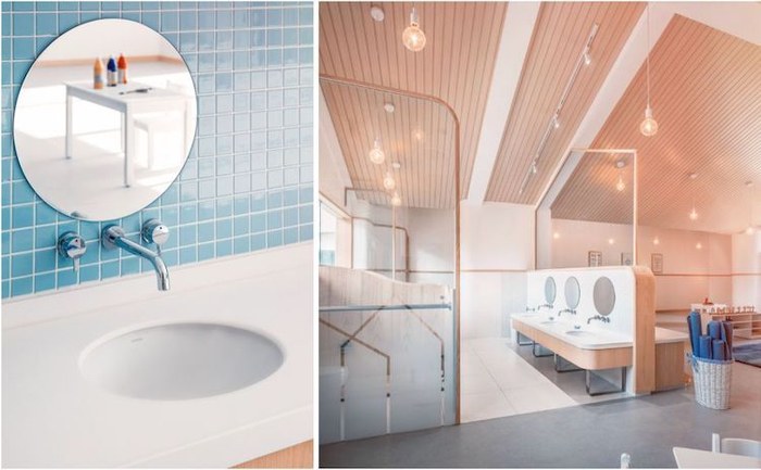 作品中类似水粉质地的蓝色和肉粉色、鹅黄色的配色同样体现在学校空间的色彩系统中,由此构建的静谧柔和的氛围取代了我们印象中幼儿园充满童稚气息的、明度和对比度都较高的色彩组合。