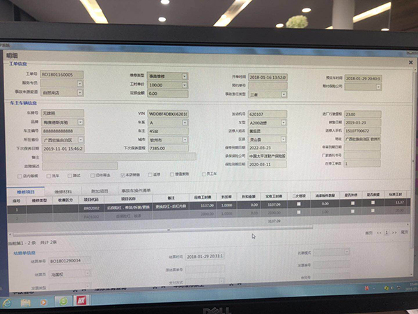 然而,今年4月6日,韦先生的妻子开车发生事故,韦先生报保险时发现,这台奔驰新车早在2018年1月16日就有过一次保修记录。据南宁恒星提供给韦先生的工单显示,该奔驰车于2018年1月16日开单,预交车时间为2018年1月29日,事故责任类型为三者(第三者责任险),承包保险公司为中国太平洋财产保险;进厂行驶里程23公里,车牌号为无牌照,车主为4S站。该车的维修项目是:后保险杠,修复/拆装/更换,更换后杠+后杠内骨,收费3137.09元。澎湃新闻注意到,该工单上显示的VIN(车辆识别代号)16位号码与韦先生购车合同上的VIN一致。