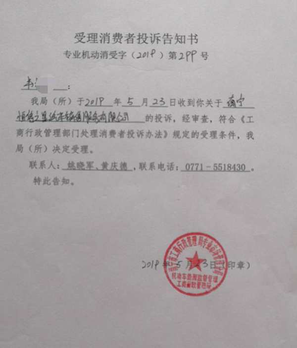 韦先生说,目前他已向南宁市工商行政管理局进行投诉。澎湃新闻获得的材料显示,韦先生的投诉已被受理。