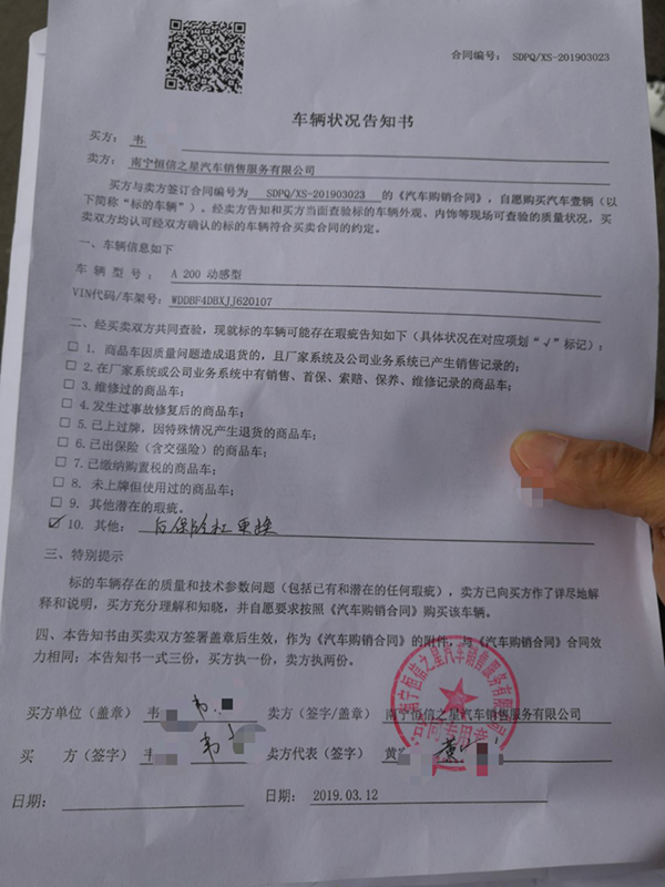 韦先生5月26日告诉澎湃新闻(www.thepaper.cn),他从南宁恒信之星汽车销售服务有限公司(以下简称:南宁恒信)购买的奔驰A200动感型,车价174100元。购车时他曾询问过销售员该车是否有过事故、维修、转户等情况,得到否定回答后,他放心签订了相关合同,并缴纳新车购置税,以及购买新车保险。