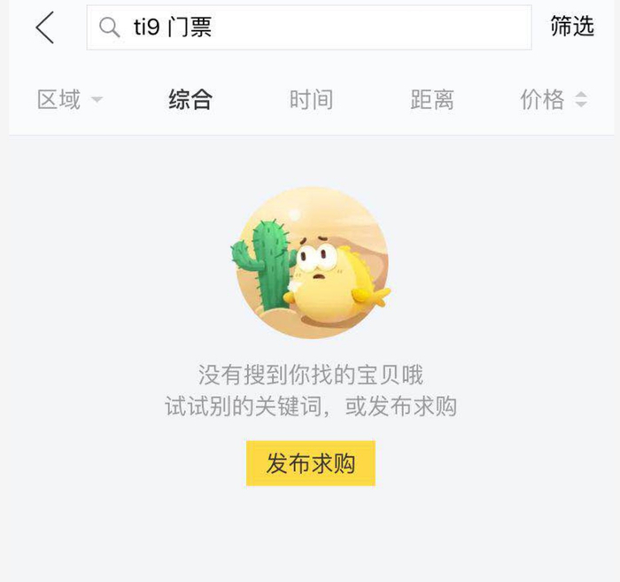 如今国内的二手市场商搜索“TI9 门票“已无法显示搜索结果