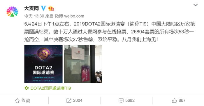 “由于我们接到Valve通知,希望所有特权码用户都能参与到TI9的抢票中来,TI9现场门票售票时间将延后1个小时,特权码用户将在13:00开启抢票。”中午12点时,DOTA2官微发布延迟开抢通告。